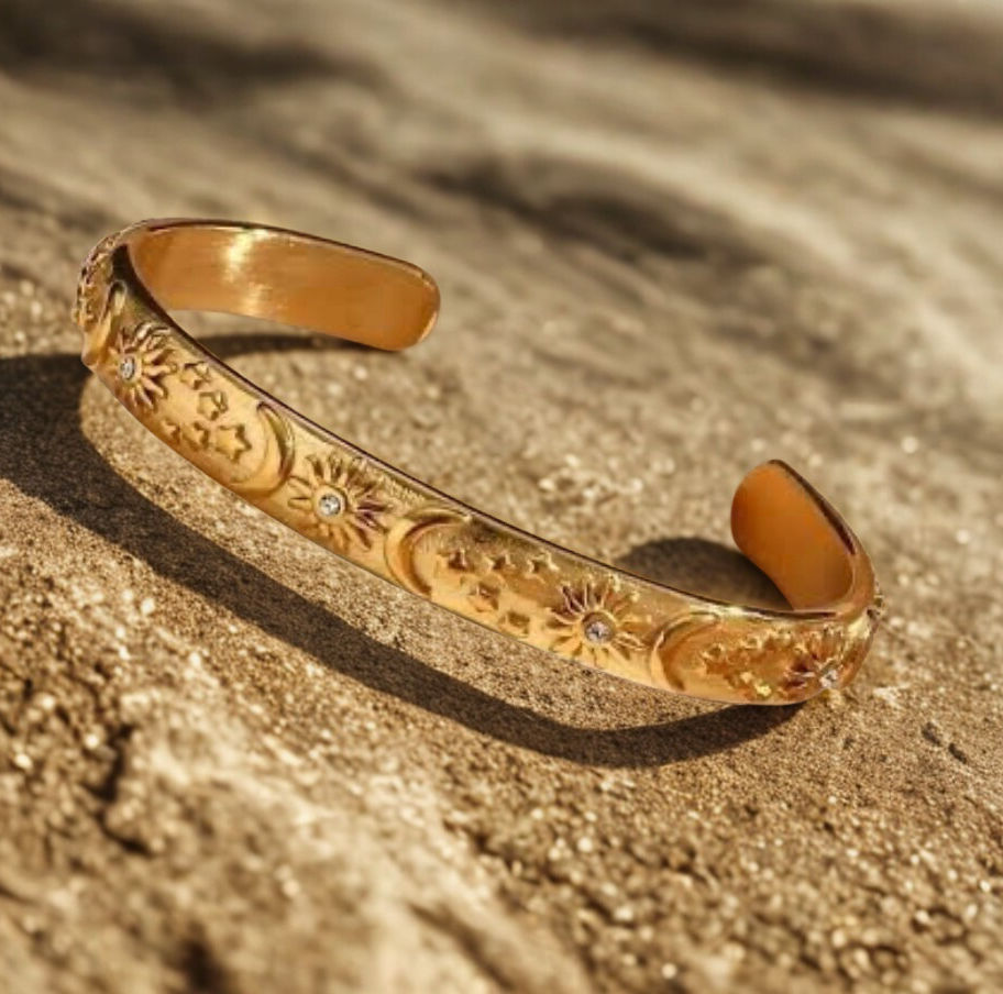 Discover the allure of the Lola Cuff from Solunah, a cosmic style bracelet blending coastal elegance with celestial charm. Crafted from stainless steel and gold plated, it embodies timeless beauty and durability. Capture the spirit of the ocean and the mysteries of the stars. Elevate any outfit with this exquisite accessory reflecting quality and style. Indulge in the essence of Solunah, where every piece is unique and extraordinary.
