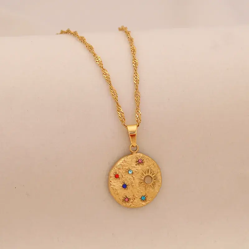 Elevate your elegance with the Tiani Necklace from Solunah. This piece features a luxurious Stainless Steel Zircon Star Sun Pendant, vacuum-plated in 18K gold. Capturing the ocean and stars' essence, it’s an enchanting addition to any collection. Let the Tiani Necklace shine as a symbol of your unique style and grace.